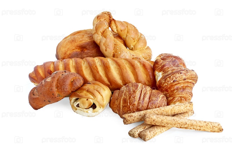 Белый пшеничный хлеб, булочки с маком и изюмом, два круассана, хлебные палочки, батон на белом фоне