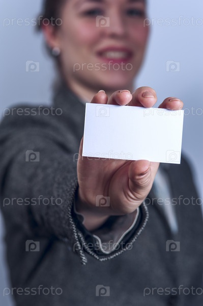 Молодая женщина в сером костюме с визиткой