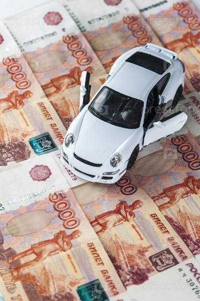 Белый игрушечный автомобиль на фоне банкнот