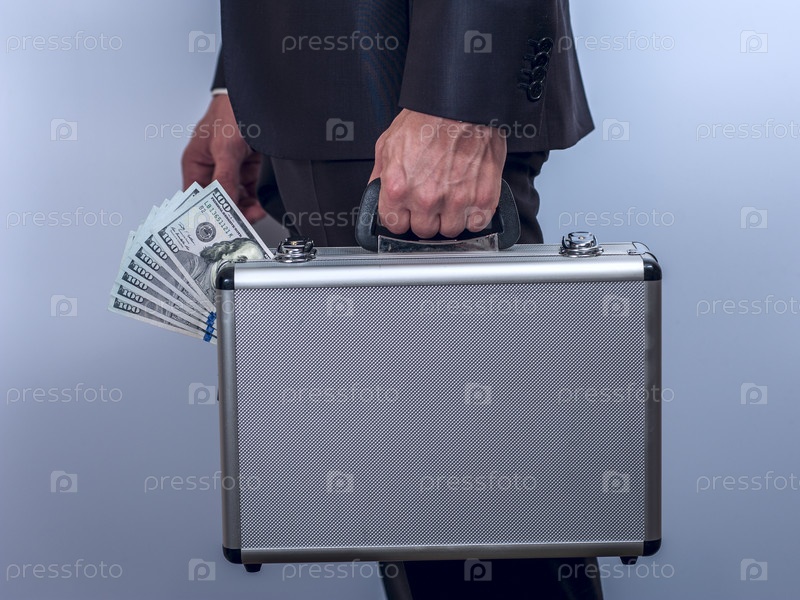Женщина в костюме с портфелем с долларами