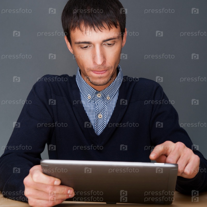 Бизнесмен с планшетным компьютером на сером фоне