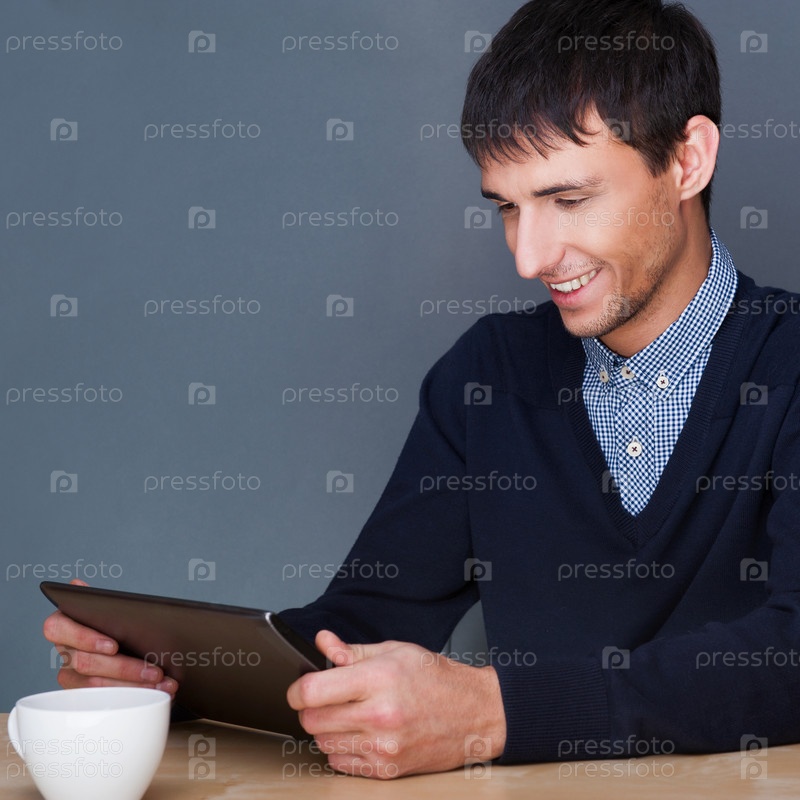Бизнесмен с планшетным компьютером на сером фоне