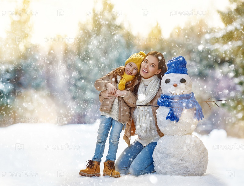 Мать и дочь со снеговиком