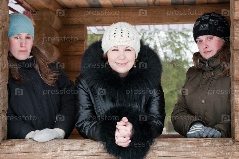 Три молодые женщины зимой в оконном проеме деревянного дома