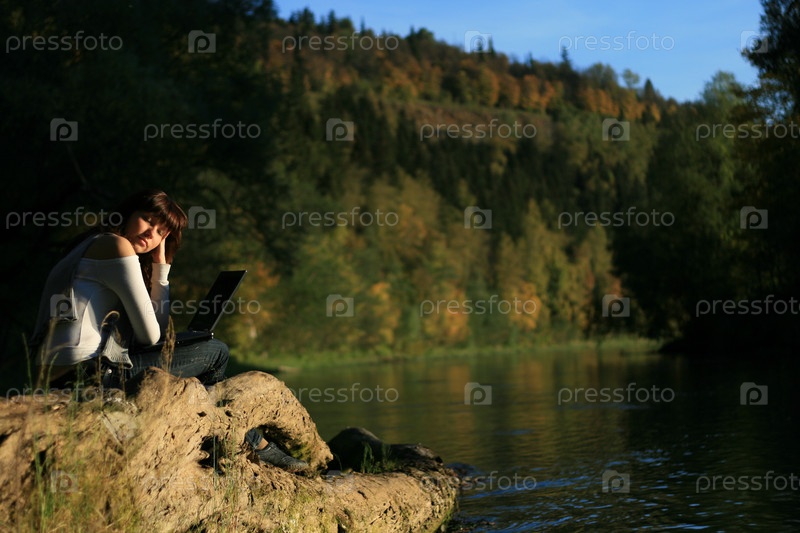 Девушка с ноутбуком на берегу
