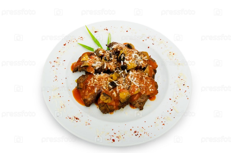 Мясо под вкусным соусом на тарелке