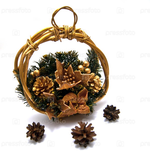 Три шишки и рождественская корзина на белом фоне