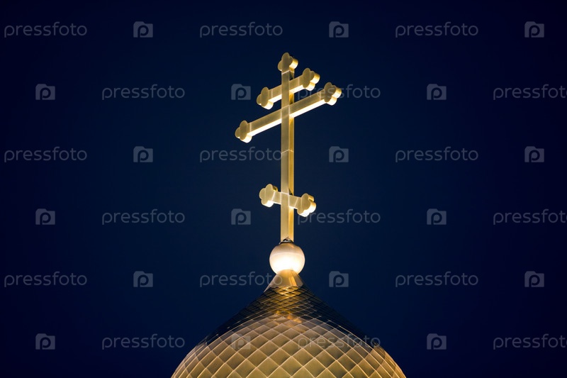 Близкий план золотого купола православного храма с большим крестом ночью