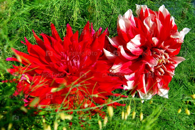 Красные георгины на зеленой траве