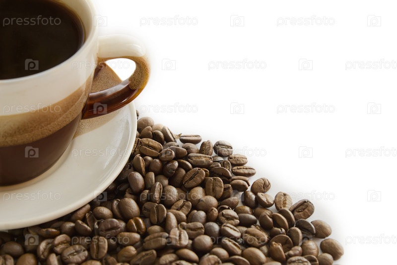 Чашка кофе и зерна на белом фоне