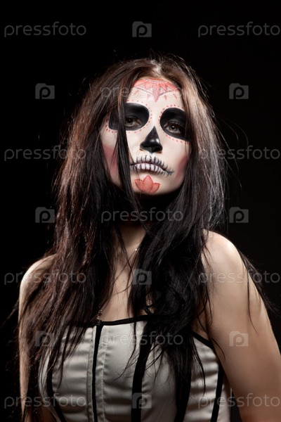 Молодая женщина с нарисованным черепом на лице