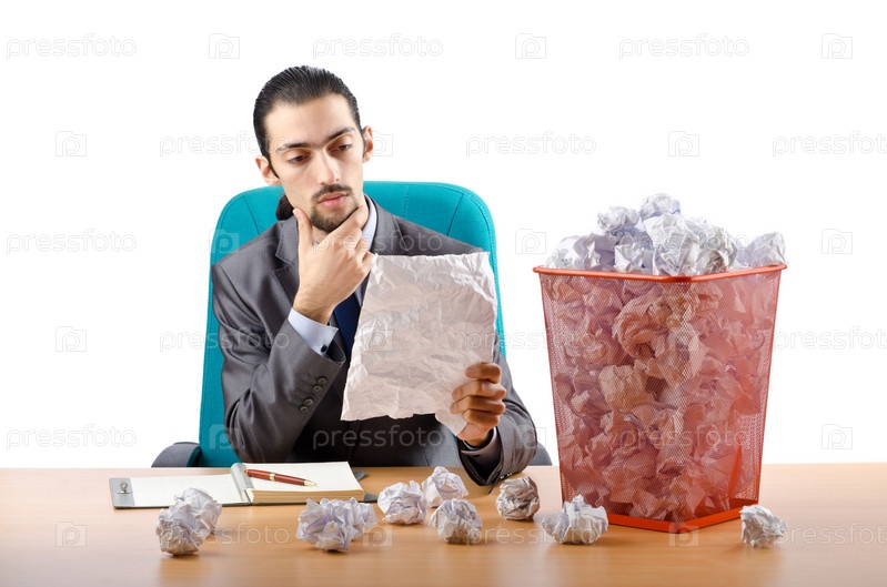 Человек с большим количеством испорченной бумаги