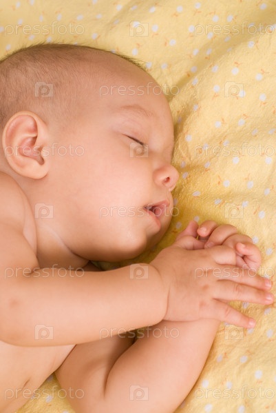 Счастливый ребенок спит на желтом фоне