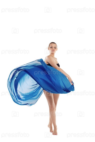 Молодая женщина танцует с синей тканью