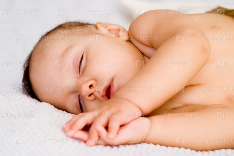 Младенец спит на белой простыне