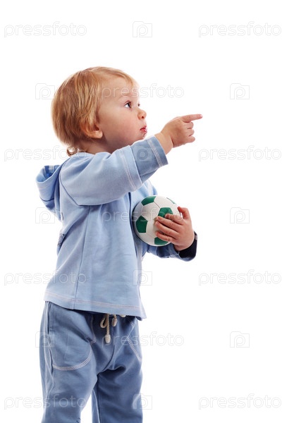 Маленький мальчик с футбольным мячом в руках на белом фоне