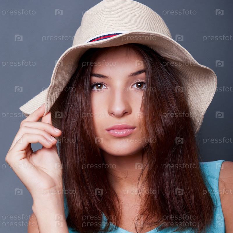 Молодая женщина в шляпе на синем фоне