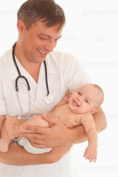Доктор с новорожденным на белом