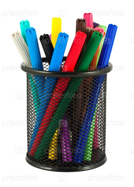 Фломастеры в стакане на белом фоне