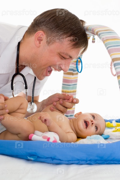 Доктор с новорожденным на белом