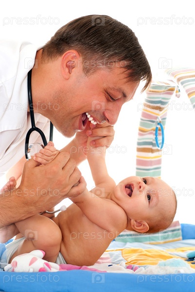 Доктор с новорожденным на белом