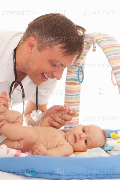 Доктор с новорожденным на белом