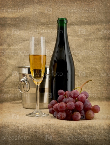 Натюрм с бокалом вина и бутылкой шампанского