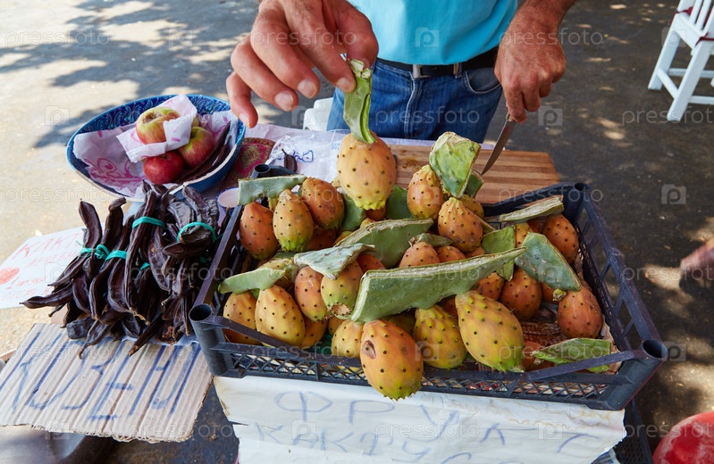 Продажа фруктов на улице - яблоки, кактусы, фасоль