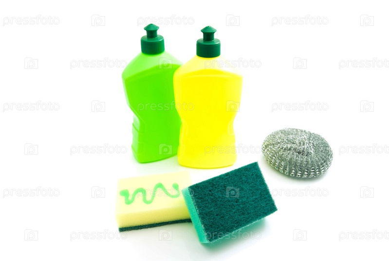 Различные губки и две бутылки