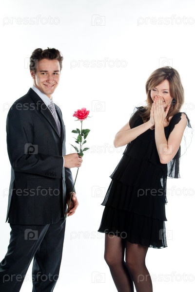 Мужчина дарит девушке розу на белом фоне