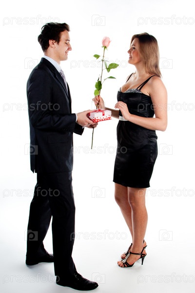 Мужчина дарит девушке розу на белом фоне