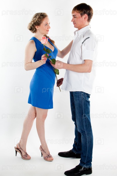 Молодой человек и девушка с розой на белом фоне