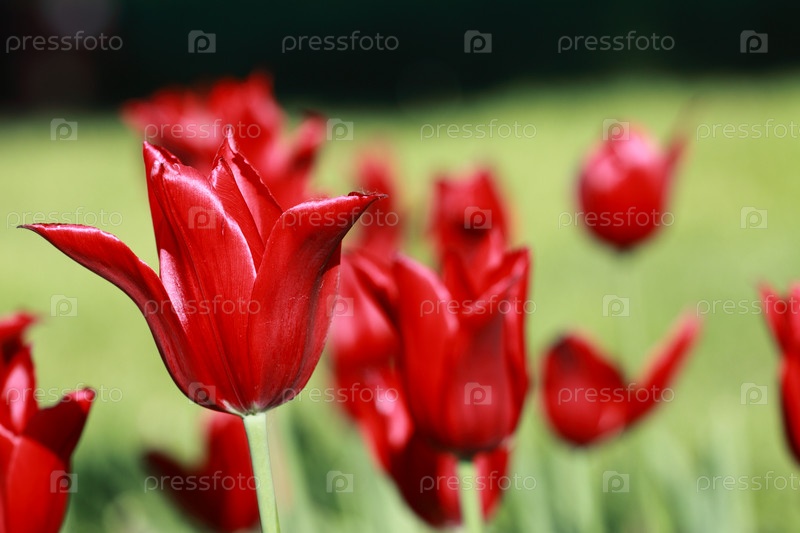 Красные тюльпаны на зеленом фоне крупным планом
