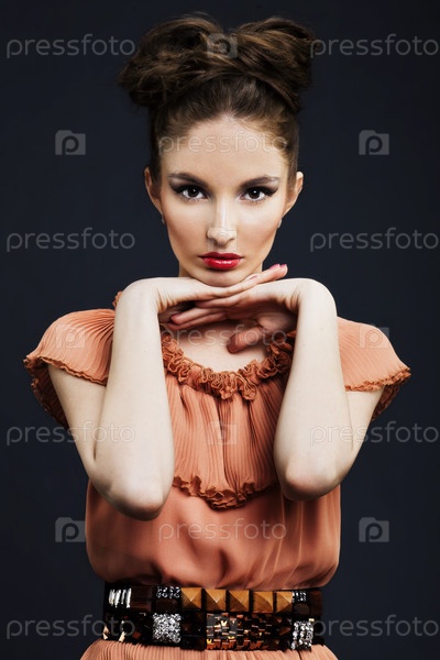 Модель в красивом рыжем платье с поясом сложила руки под подбородком на черном фоне