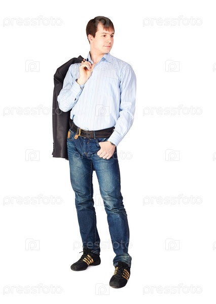 Молодой мужчина в джинсах на белом фоне