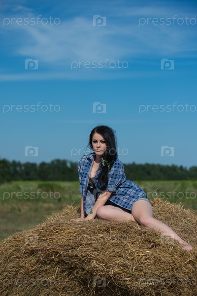 Молодая симпатичная девушка на стоге сена