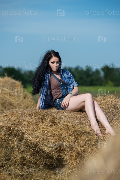 Молодая симпатичная девушка на стоге сена