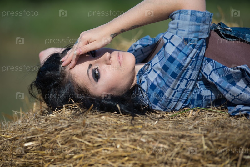 Молодая симпатичная девушка на стоге сена