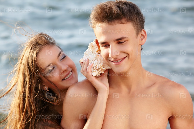 Красивая девушка подставила морскую раковину к уху мужчины