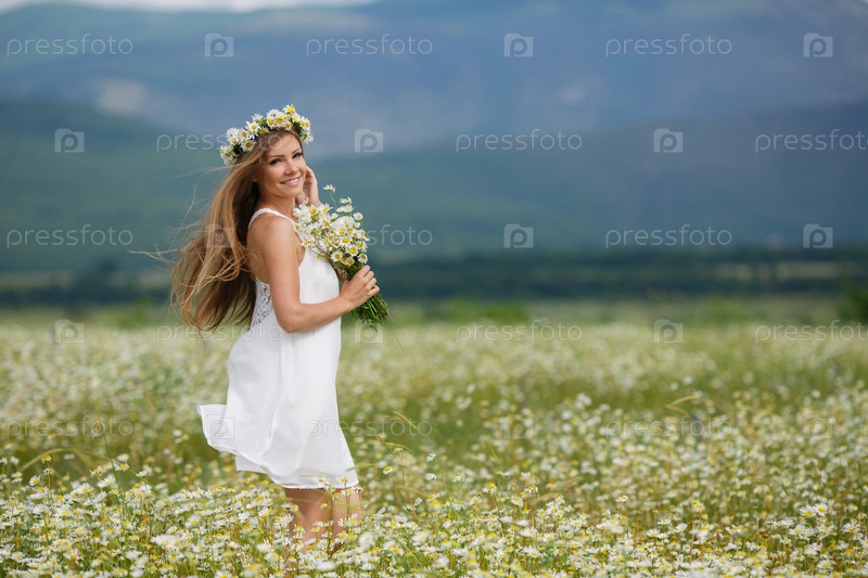 Красивая женщина в ромашковом поле