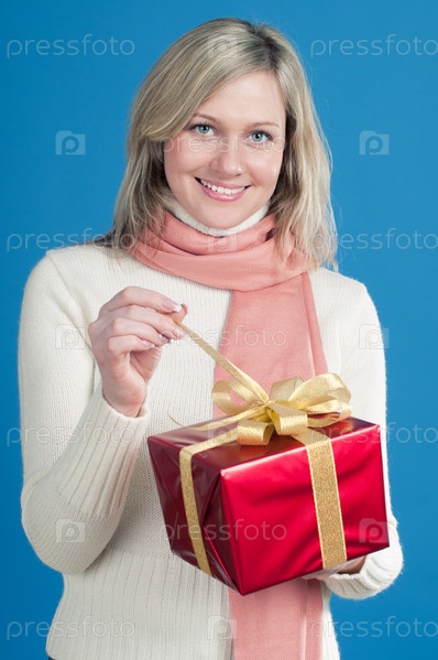 Улыбающаяся молодая женщина, открывающая подарочную коробку