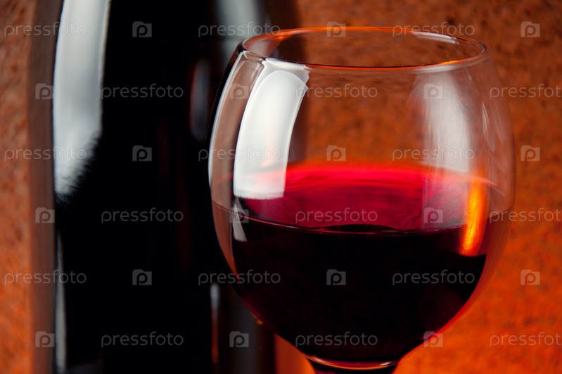 Бокал и бутылка с красным вином на ярком, теплом фоне