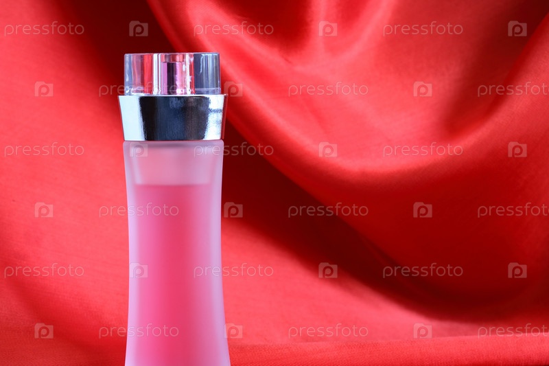 Стильный розовый флакон туалетной воды на фоне красного шелка с местом для текста