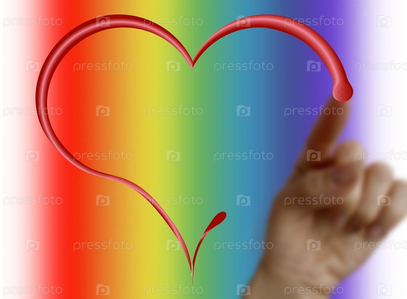 Рука рисует сердце на радужном фоне