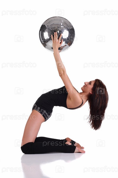 Танцовщица держит диско-шар, изолированная на белом фоне