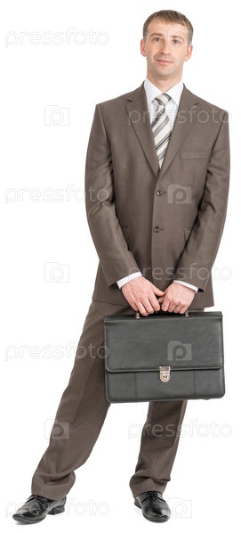 Бизнесмен, стоя с чемоданом