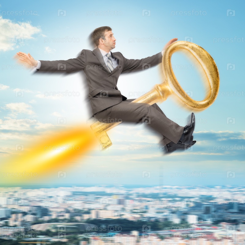 Бизнесмен, летит на Золотом ключе над городом