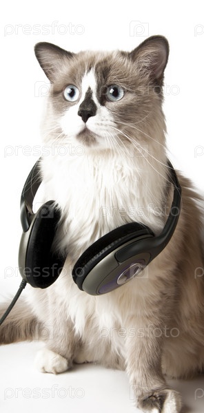 Кот с наушниками, белый фон