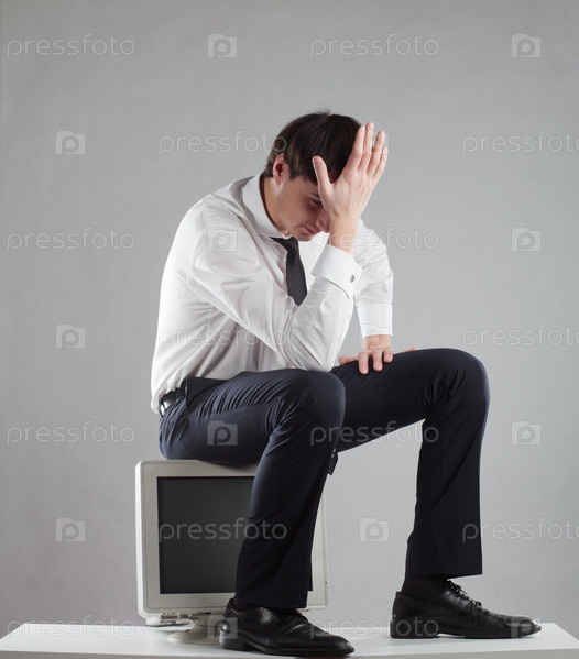 Задумчивый деловой мужчина, сидящий на мониторе