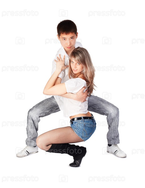 Танцующая молодая пара, изолированы на белом фоне